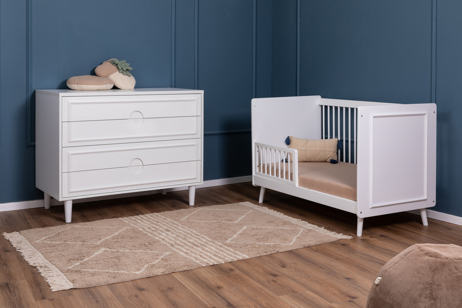 פרופילי עץ המעטרים את ראש המיטה והופכים אותה לכה ייחודית. המיטה גדלה עם התינוק והופכת למיטת מעבר עם מעקה טודלר כלול בערכה.