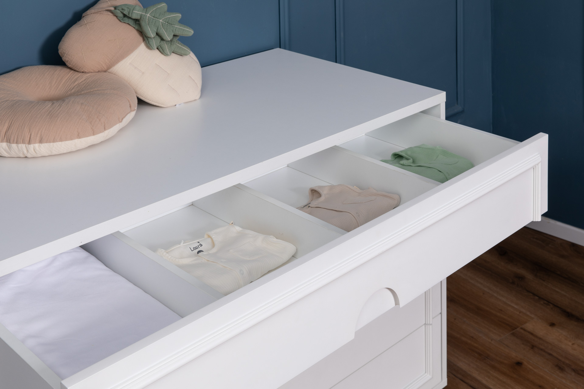 מגירה עליונה בעלת חלוקה פנימית ל-4 תאים לסידור אופטימלי של מוצרי הטיפול וההחתלה.