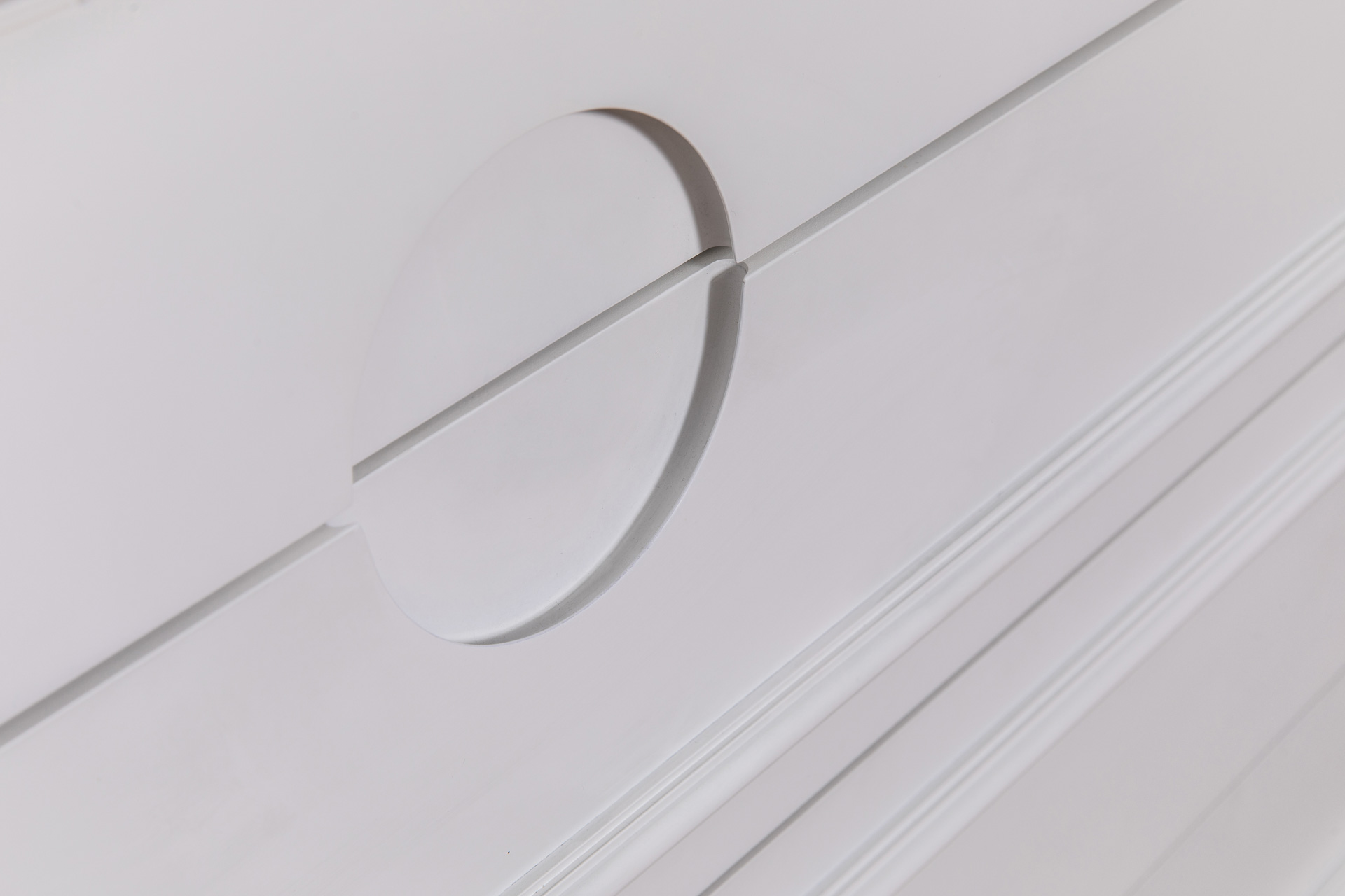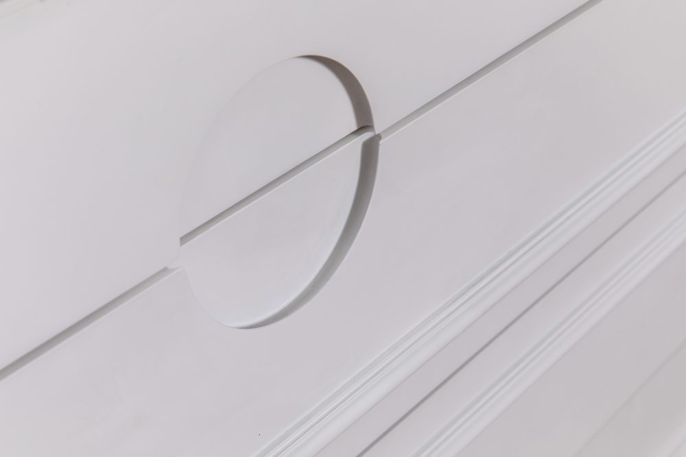 שידה שאין דומה לה! שידה מעוטרת בפרופילי עץ בשילוב הרמוני עם ידיות אינטגרליות עגולות.